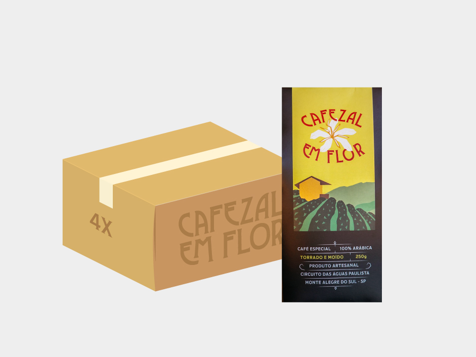 Caixa com 4 pacotes de 250g do café. Cafezal em Flor – Café especial 100% arábica torra média. O Café Fermentado da Marvada é um café especial da variedade Tupi que passou por um  processo de maceração carbonica, igual ao que ocorre nos vinhos. Fermentamos os frutos de café com a levedura usada para fazer CACHAÇA.